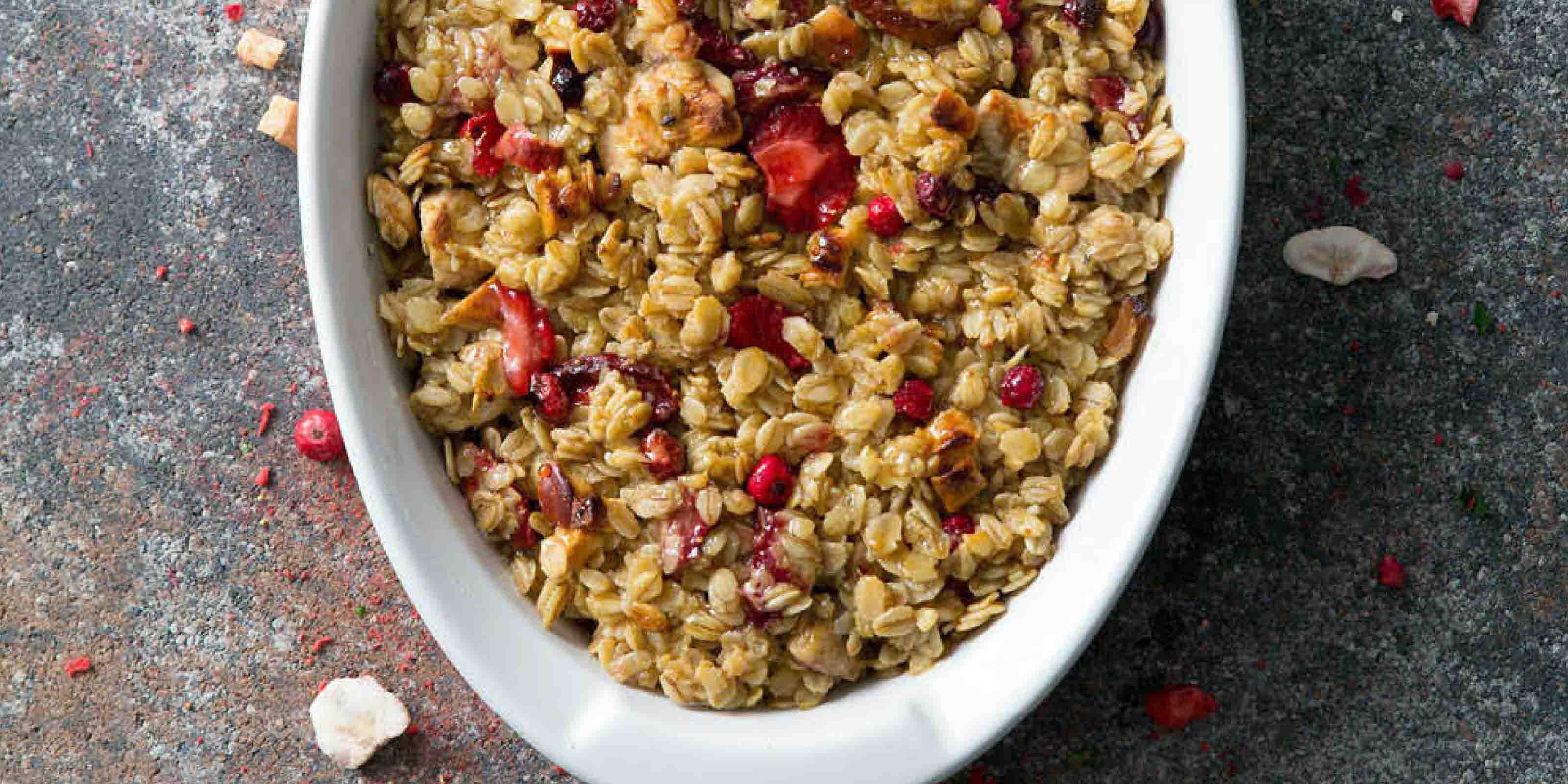 4. Den Haferflocken-Teig in eine 20 x 20 cm große Auflaufform geben und für etwa 30 Minuten goldbraun backen.